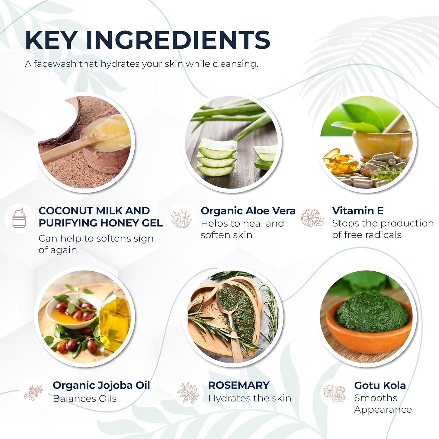 - GENTLE AND MOISTURIZING CLEANSER: Premium botanical ingredients including Honey, Coconut Milk, Vitamin E, Organic Jojoba Oil, and Rosemary simultaneously moisturize and renew for a smooth youthful complexion