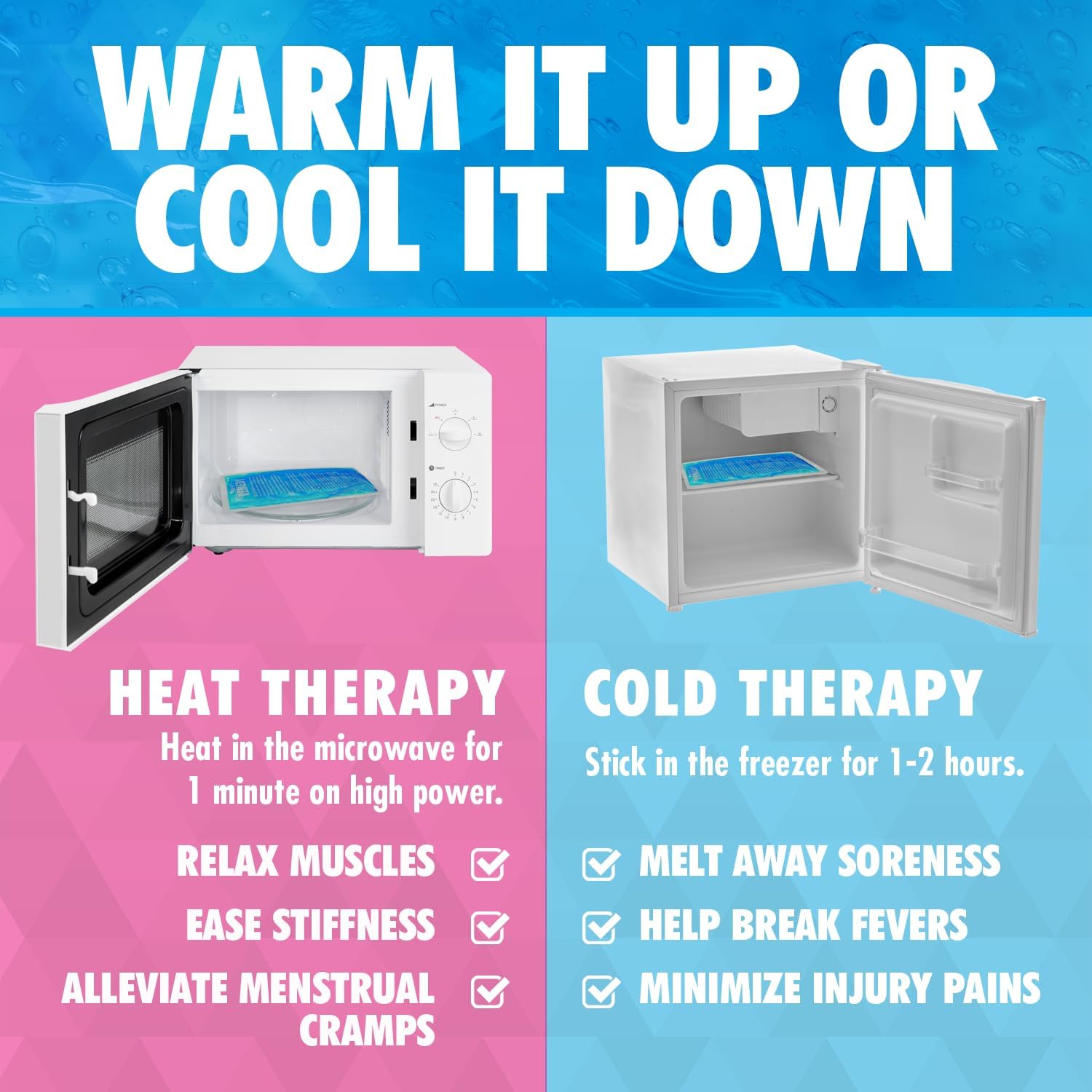 - FOR HOT AND COLD COMPRESS: Struggling with cramps or a stomach ache? Our soft ice packs also work like hot water bottles, providing soothing heat therapy. You can count on our hot and cold pack for pain relief whenever and wherever you need it.