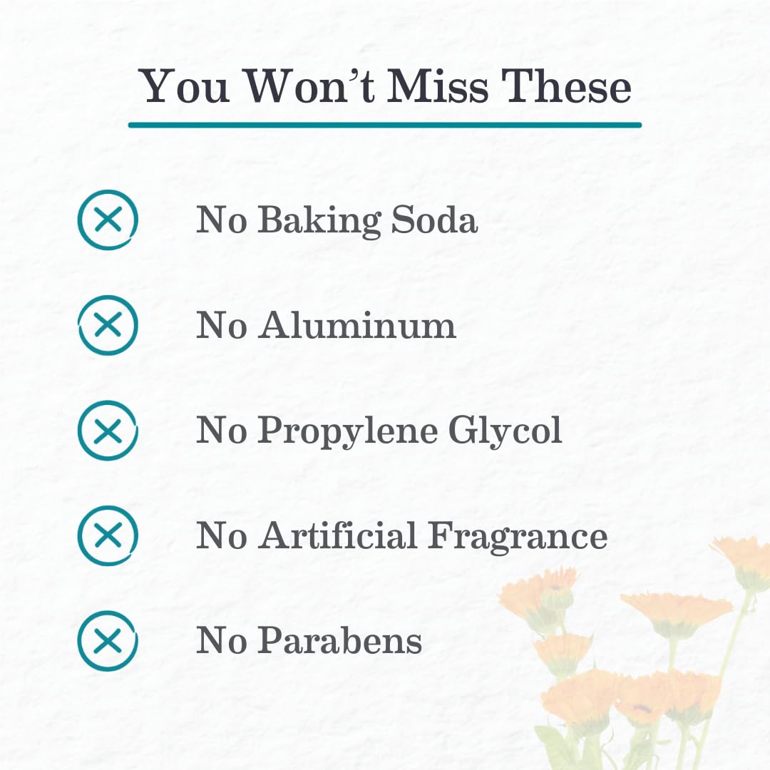- NO WORRISOME CHEMICALS: Everything you want and nothing you don't! No artificial fragrance, propylene glycol, parabens or aluminum. This formula was made for extra sensitive skin with the perfect balance of baking soda and magnesium. Just enough to work, not enough to hurt.