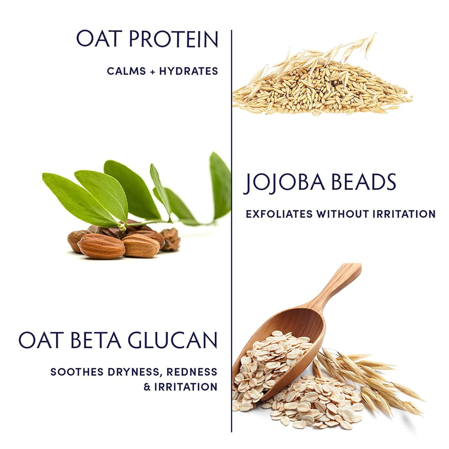 - Exfoliating Face Wash: Jojoba Beads gently exfoliate without damaging the skin barrier, Oat Protein hydrates skin, while Oat beta glucan helps soothe dryness and redness