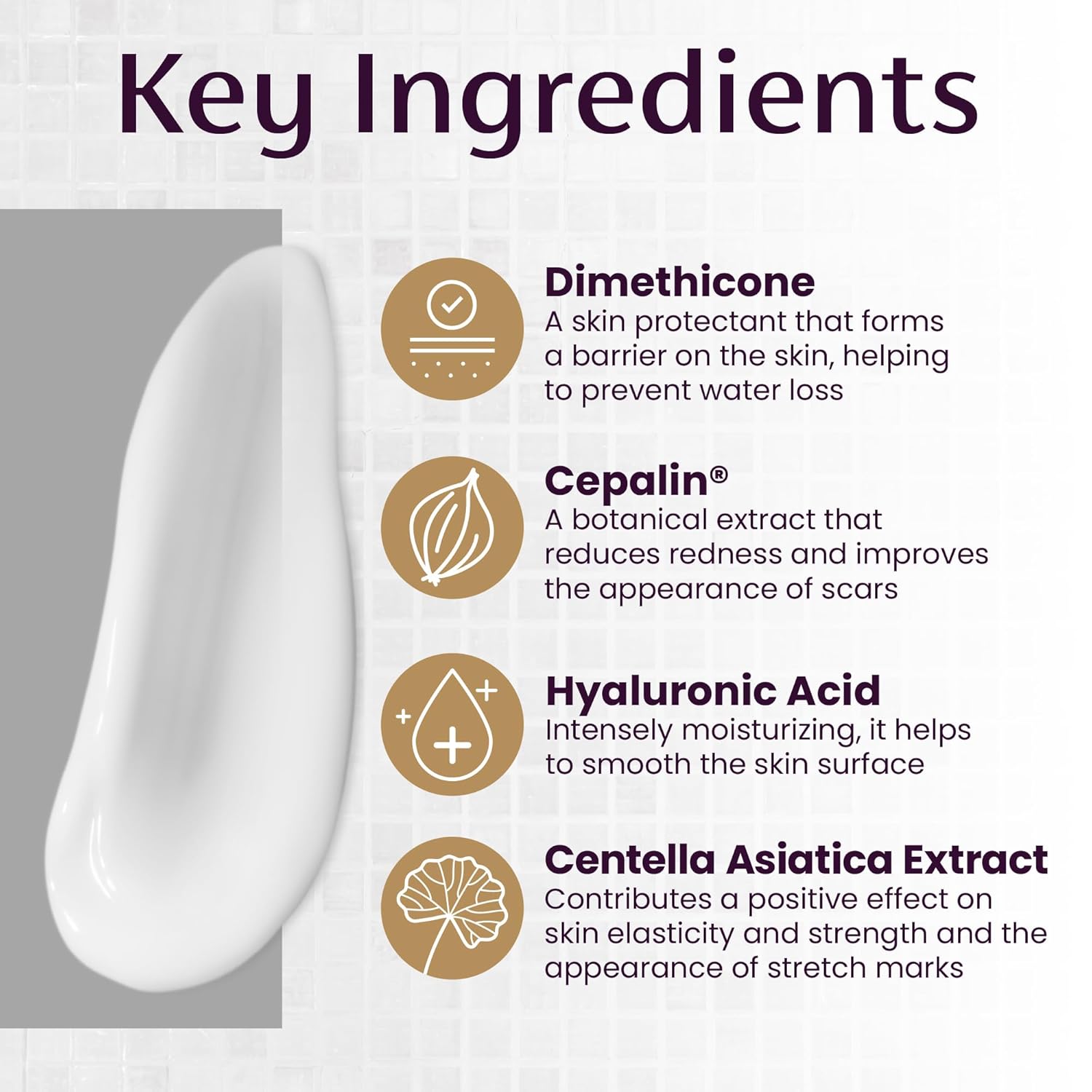 - INTENSIVE CREAM FORMULA: With Cepalin botanical extract, Hyaluronic Acid and Centella asiatica extract to moisturize, nourish the skin and visibly reduce stretch marks