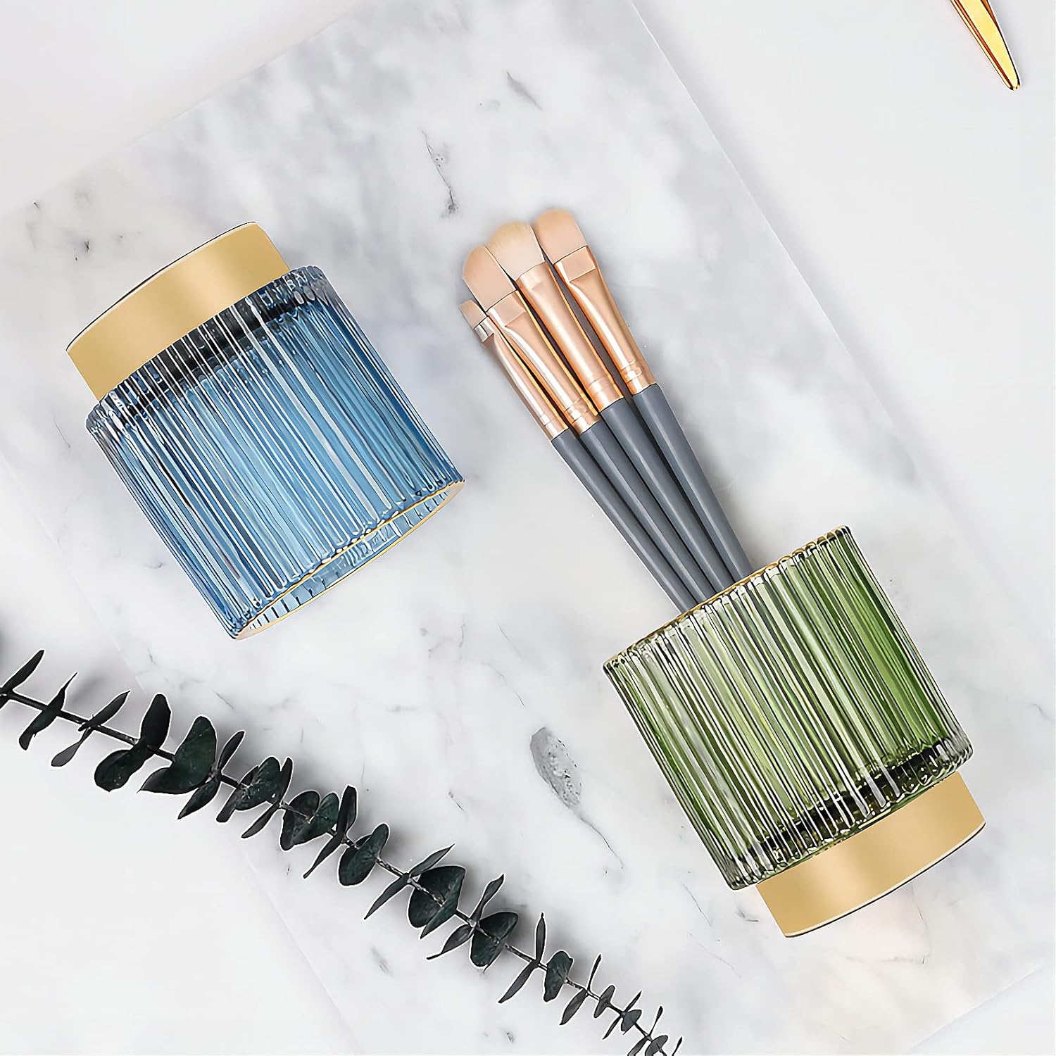 - 1.CREATIVE DESIGN:Retro color and Striped design.The makeup stand is a metal base,and the edge of the bottle mouth tube of the makeup stand is designed with metal gold plating,it is very beautiful and luxurious.