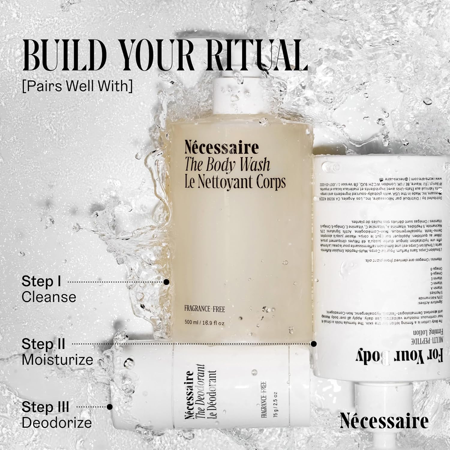 Nécessaire The Body Wash. Fragrance-Free. Multi-Vitamin Gel Cleanser. Nourish, Soften. Hypoallergenic. Dermatologist-Tested. No SLS/SLES. 250 ml / 8.4 fl oz