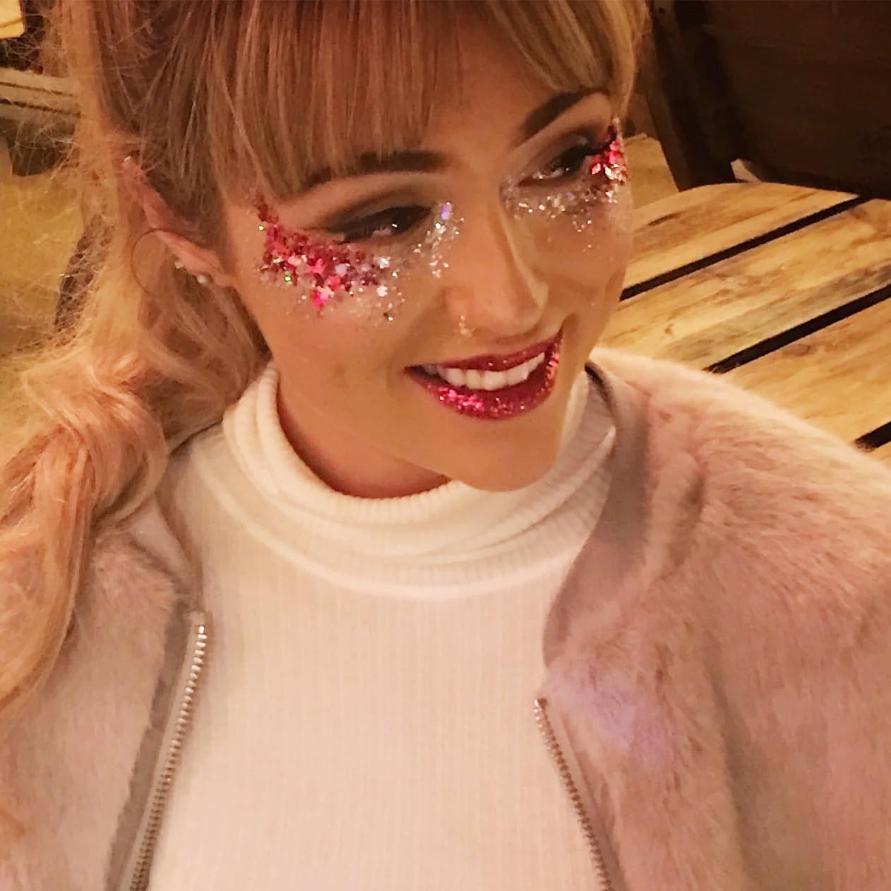 - Red Glitter Face Paint Holographic Effect:This chunky glitter blends with plenty of different shapes and sizes of chunky and fine glitters in a gel base,great for a metallic coverage wtih a holographic effect.The mermaid sequin glitters have vibrant color,which shows up as an ultra-reflective and shiny sparking shimmer smear.