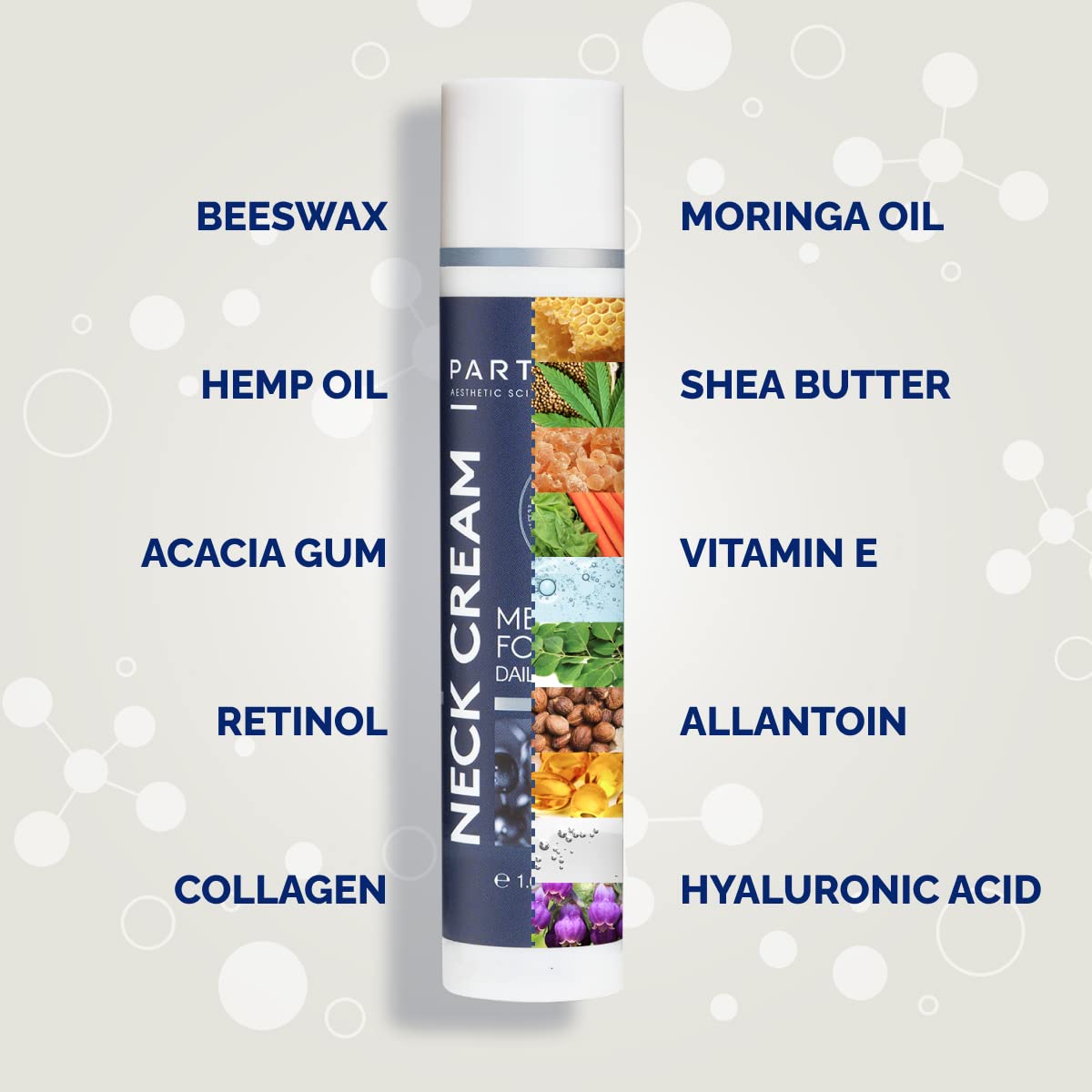- ANTI-AGING AND VISIBLY TIGHTENS NECK SKIN Particle Neck Cream tightens neck skin for a youthful look. Formulated with collagen, hyaluronic acid, retinol, and moisturizers, it reduces wrinkles and fine lines, providing long-lasting hydration and improved skin elasticity.