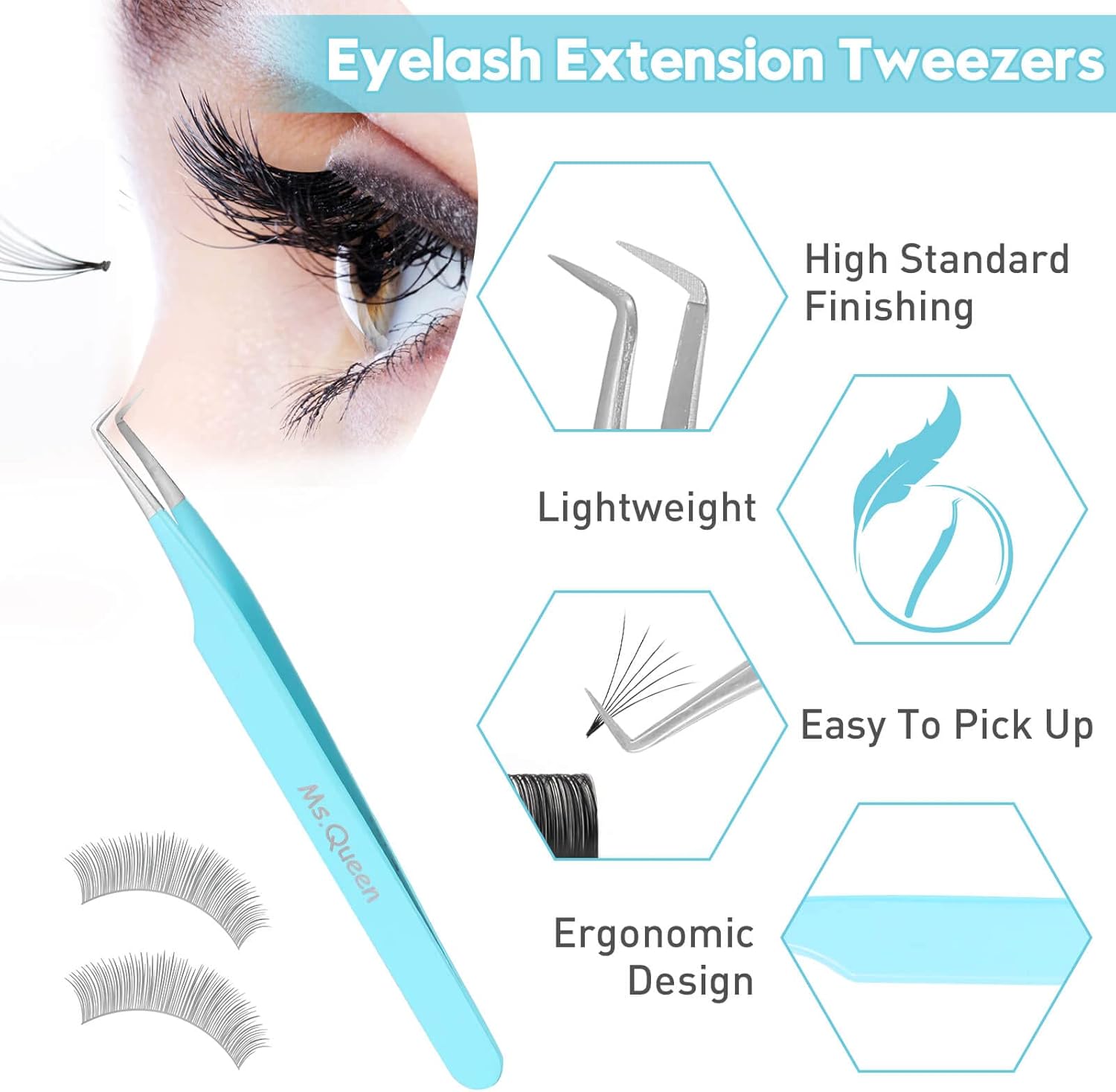 Ms.Queen Lash Tweezers for Eyelash Extensions, Precision Fiber Tip 90 Degree Tweezers for Mega Volume Lashes Extensions, Blue
