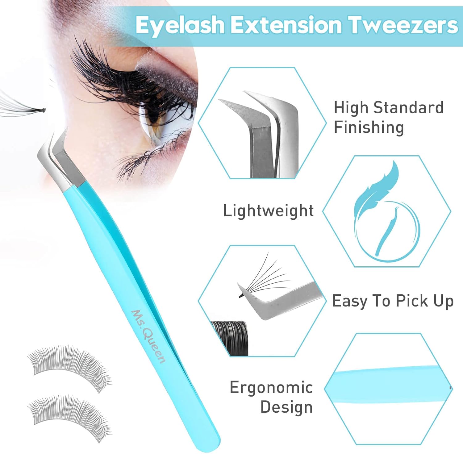 Ms.Queen Volume Lash Tweezers, Fiber Grip L-Angled Tips Boot Tweezers for Mega Volume Eyelash Extensions, Blue