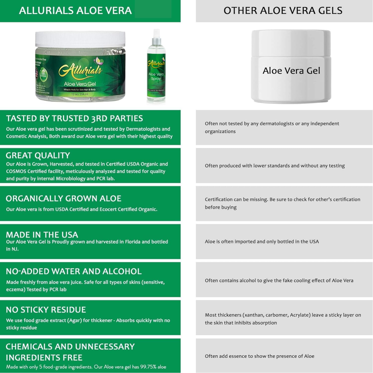 - Our pure Aloe Vera spray is perfect for all skin types as it is free from harsh chemicals like, colors, preservatives, and sulfates that can cause irritation and damage to your skin. It is also cruelty-free and environmentally friendly, making it the perfect choice for those who care about the planet and its inhabitants.