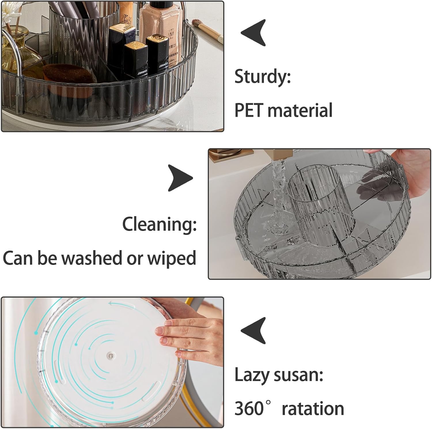 - mooth Rotation: 360 degree rotation makes it easier to find what you need and brings you a convenient using experience. Tray edges are 1.96'' high to ensure that cosmetics do not fall out when
