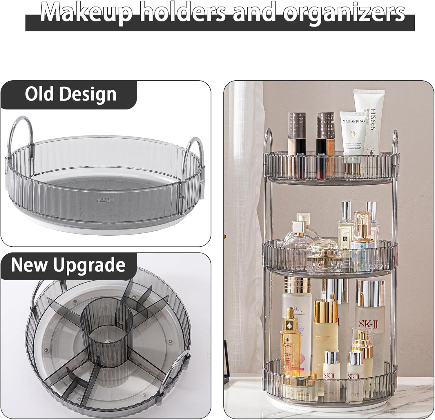 Rotating Makeup Organizer for Vanity, High-Capacity Skincare Clear Make Up Storage Perfume Organizers Cosmetic Dresser Organizer Countertop 360 Spinning (Gray, New-3 Tier)