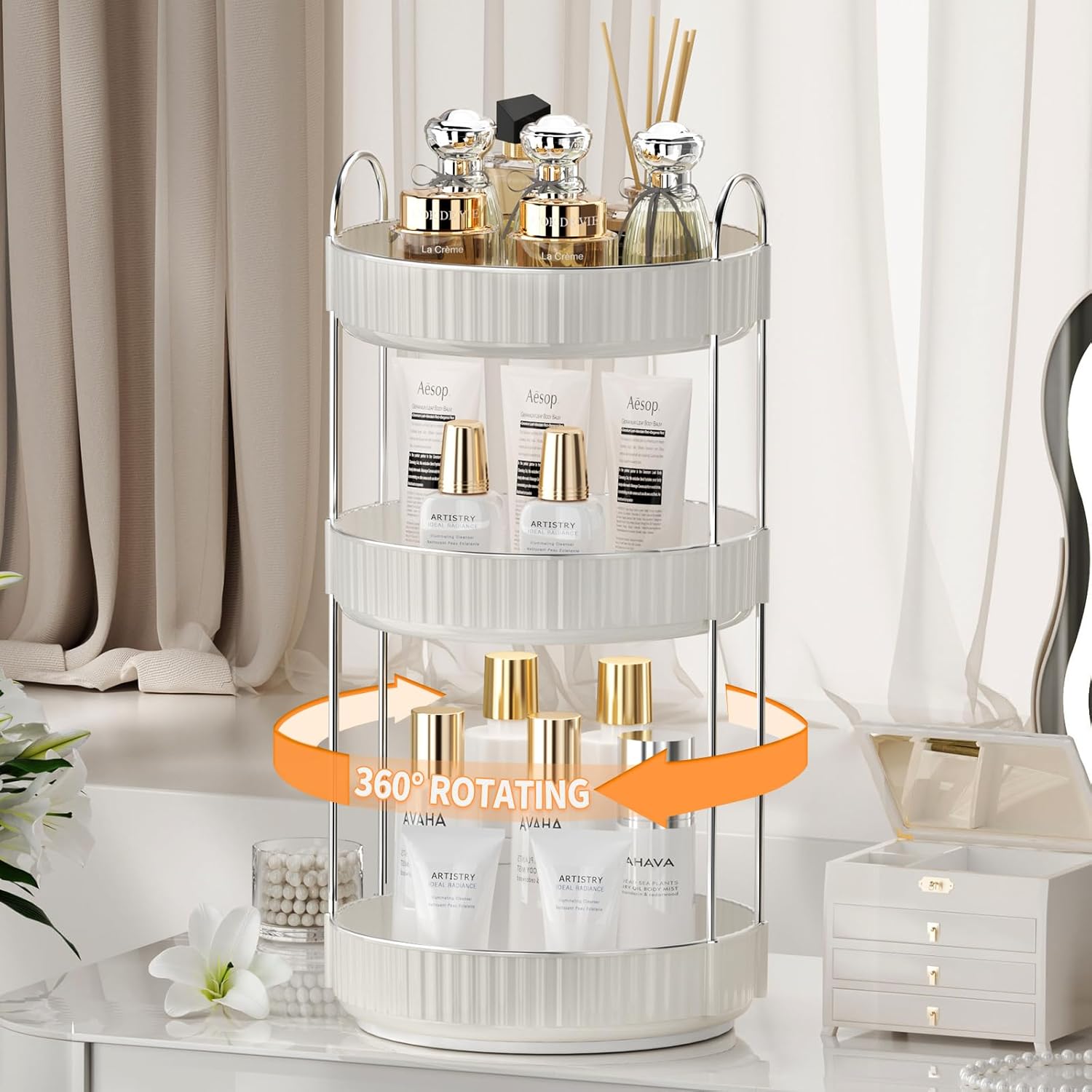 Rotating Makeup Organizer for Vanity,3 Tier High-Capacity Skincare Clear Make Up Storage Perfume Organizers Cosmetic Dresser Organizer Countertop 360 Spinning