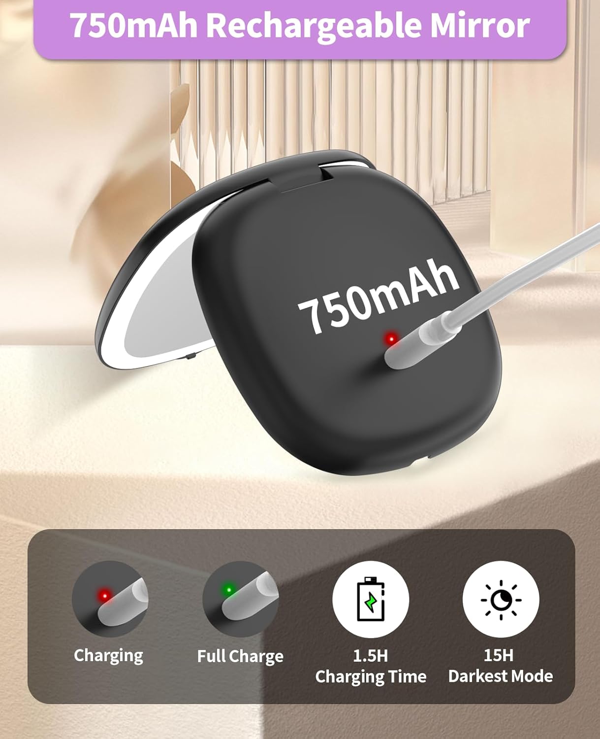 WOBSION Rechargeable Lighted Travel Makeup Mirror,1x/10x Compact Magnifying Mirror with Lights,Portable for Bag,4inch,Gift,Black