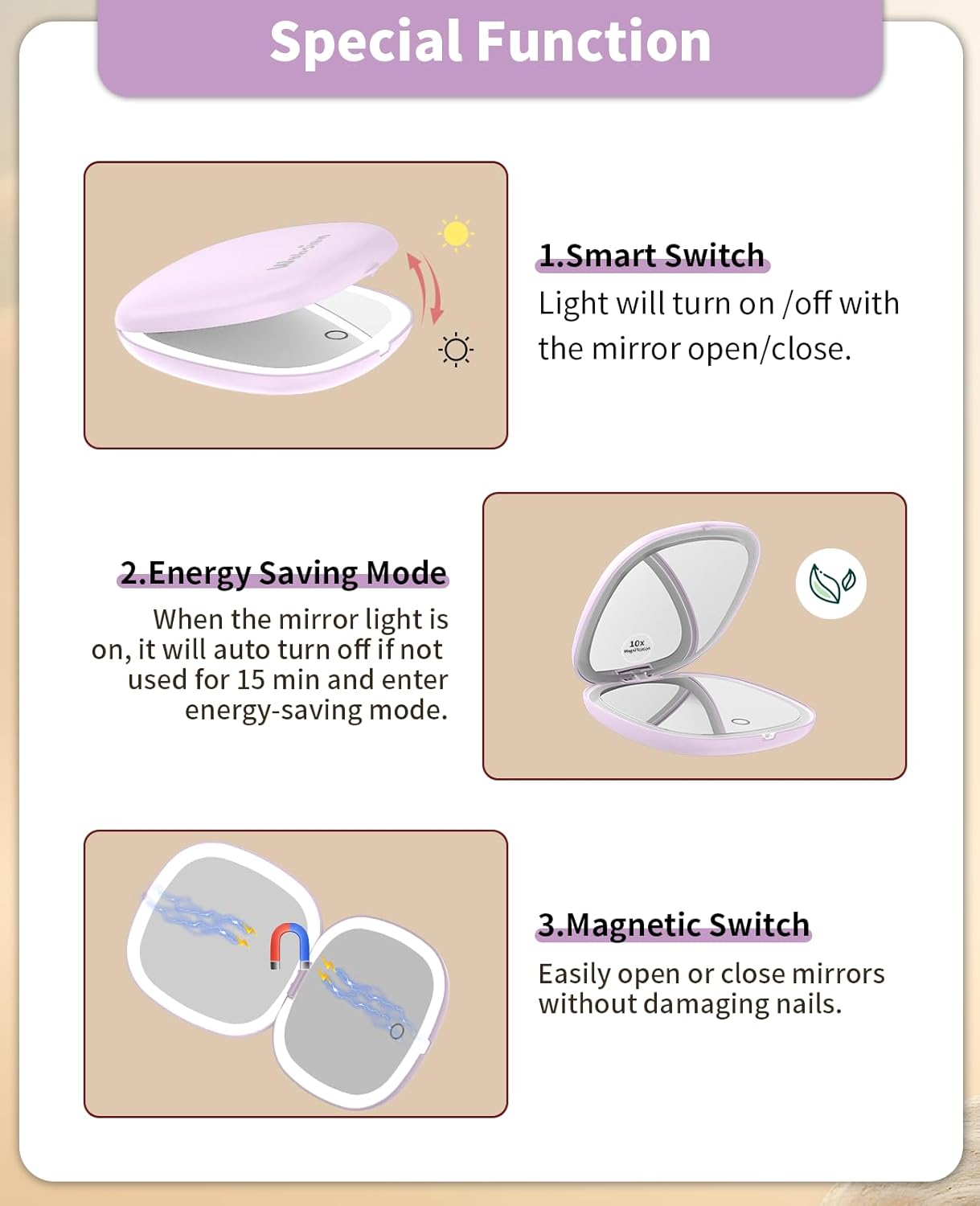 - 10x Magnifying:One side is a 1x HD mirror, equipped with white light to better restore your beauty, and the other side is a 10x magnifying mirror, which can help you magnify facial details. Tip: When using the 10x magnifying mirror, please keep a distance of less than 10 cm, otherwise it may cause normal dizziness and affect imaging