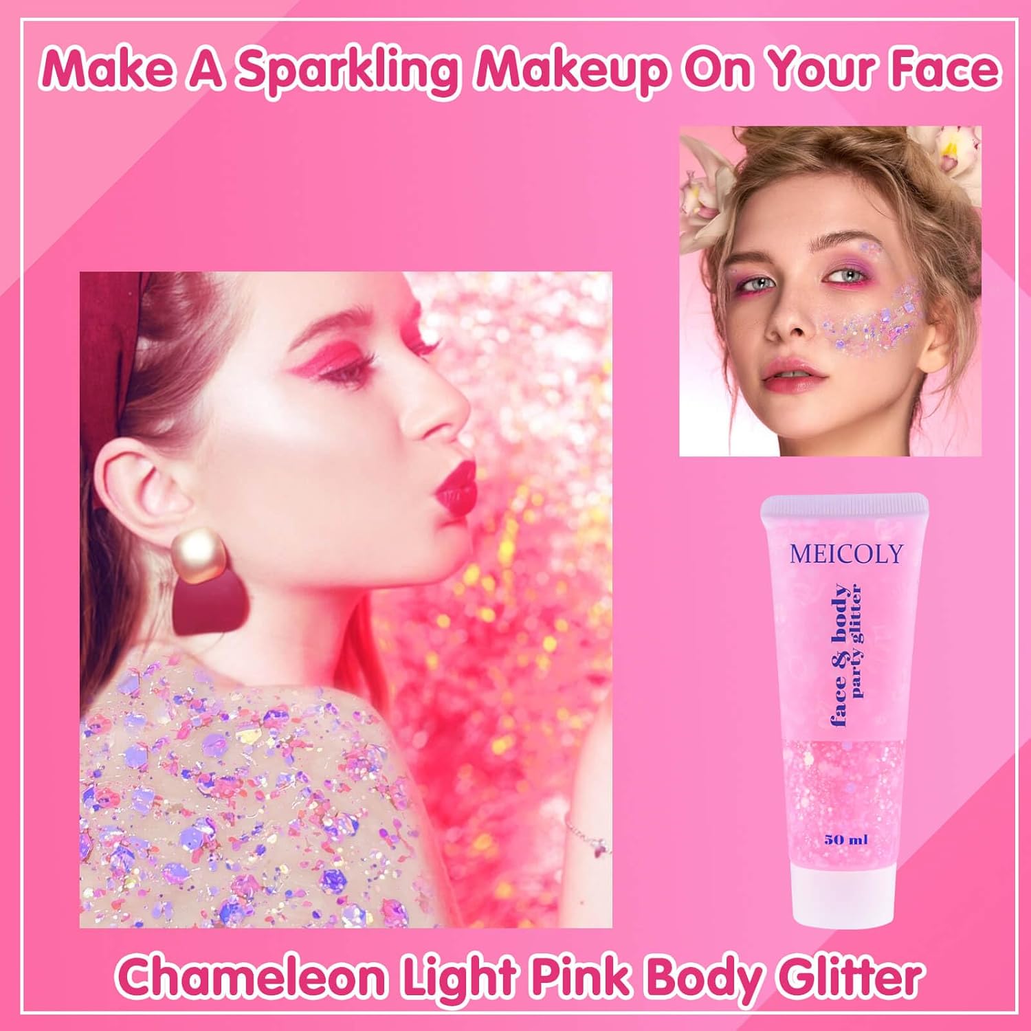 - Sparkly Chameleon Glitter Makeup:MEICOLY Chameleon body glitter has lots of glitter in the gel with beautiful color.This glitter is super dense in the gel and shimmers pretty in the light,it has a lovely shine and is stunning when the light hits it.The color shifts from different angles,also looks great in sun