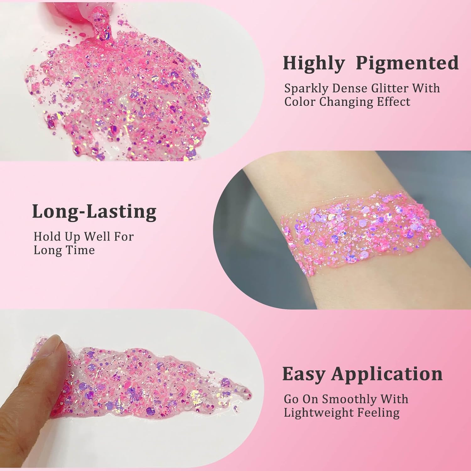 - Easy to Apply and Long Lasting:MEICOLY chameleon face glitter gel sticks to the skin very easily,it goes on smooth and dries quickly without becoming flakey,stays on well and hold up all day with bright and shiny effect