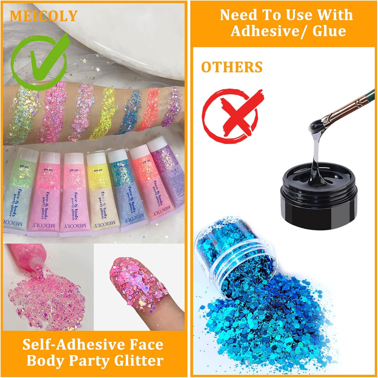 - Lightweight Glitter:MEICOLY chameleon face body glitter gel is lightweight,doesn't aggravate the skin when wearing it.Designed in tube package,easily control the amount of glitter, it spreads on easily and does not feel sticky on the skin