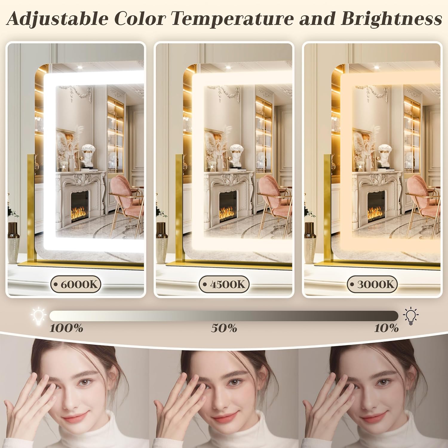 - 【Smart Dimming】 The light up vanity makeup mirror provides warm light, day light and cool light. Brightness can be adjusted from dim to bright. The makeup vanity mirror with lights provide a clean and bright reflection and allow you to get the most natural application of makeup, even at night mirror. Even with the increased light, your eyes are protected by the eye protection feature of the LED. You only need to touch a button to realize intelligent dimming.