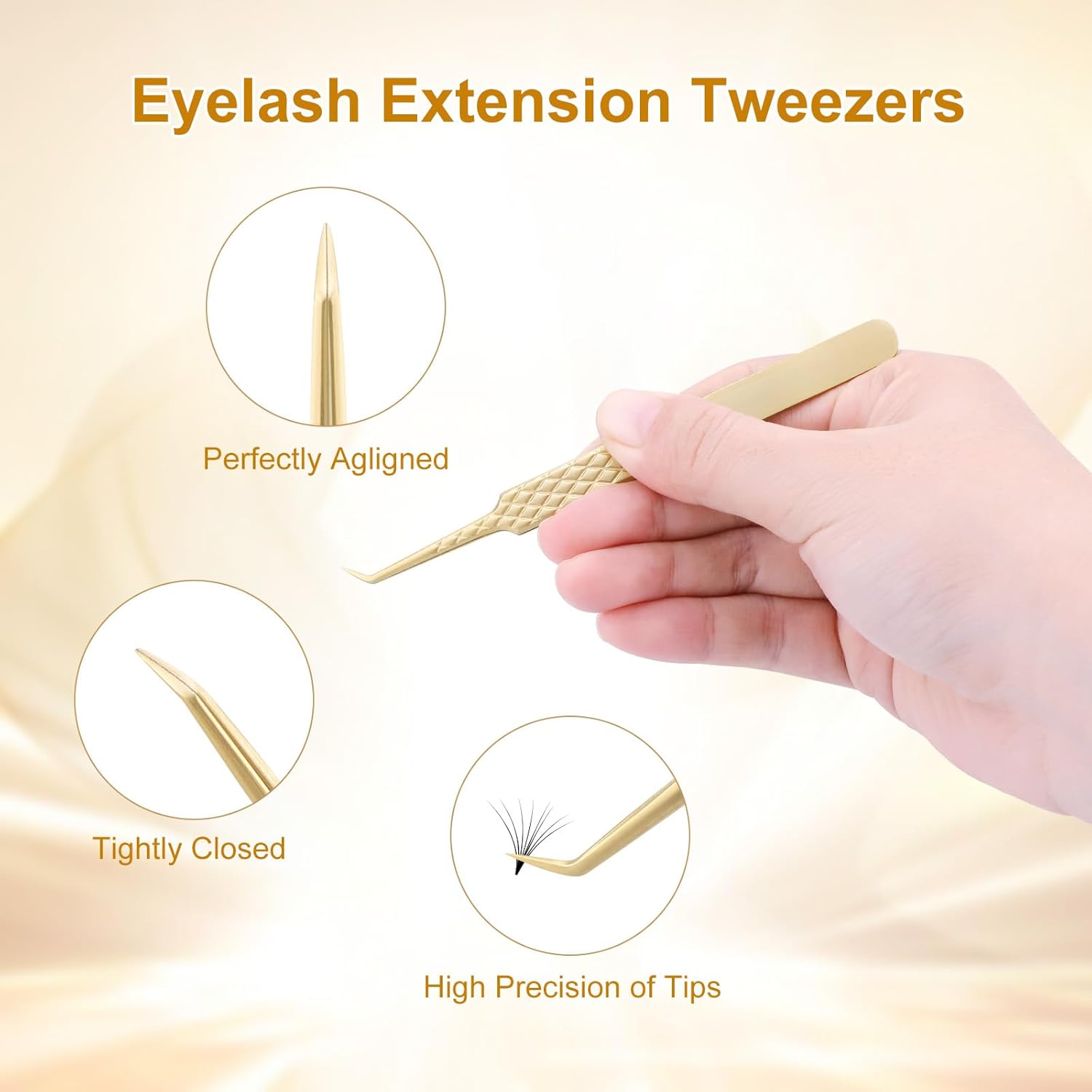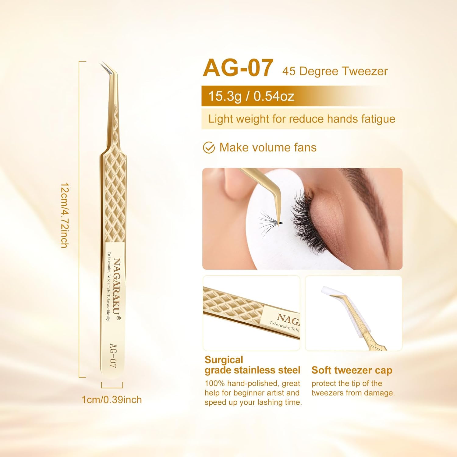 - 【45°Volume Tweezers AG-07】Colour: Gold / Length: 4.72 inches; Width: 0.39 inches. These handcrafted tweezers are made of high-strength stainless steel, which is resistant to most acids and other corrosive agents. We give each tweezer a box to protect the tweezers.