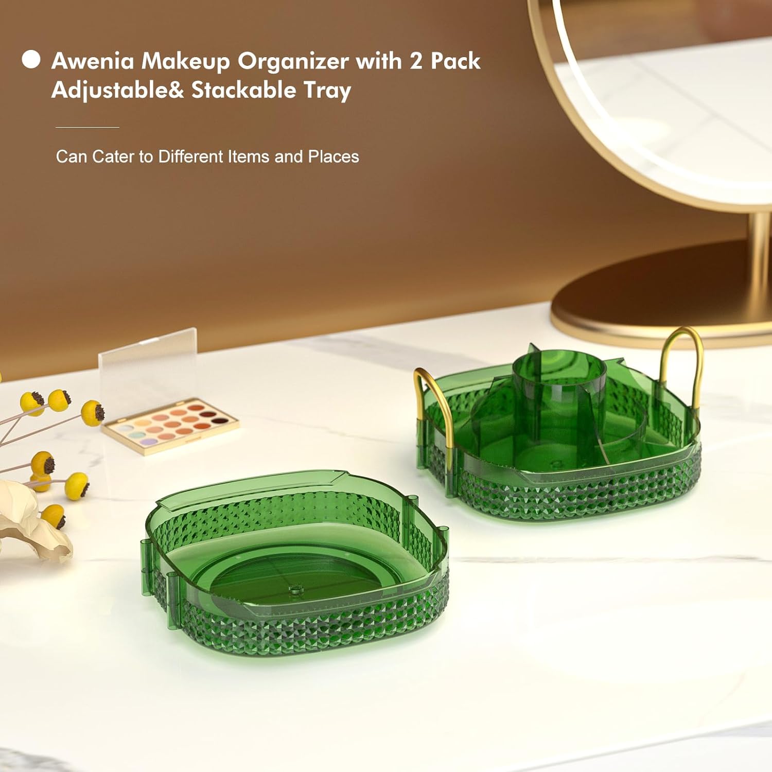 - Stackable &Adjustable:➤The lazy susan organizer is stackable if you get more Awenia clear bathroom countertop organizer and help you save 80% space.With separated top and raise,thicken edges, you can put long brushes,makeup bottle, don’t worry about falling. You can combine three adjustment plates of make up organizers according to your needs.