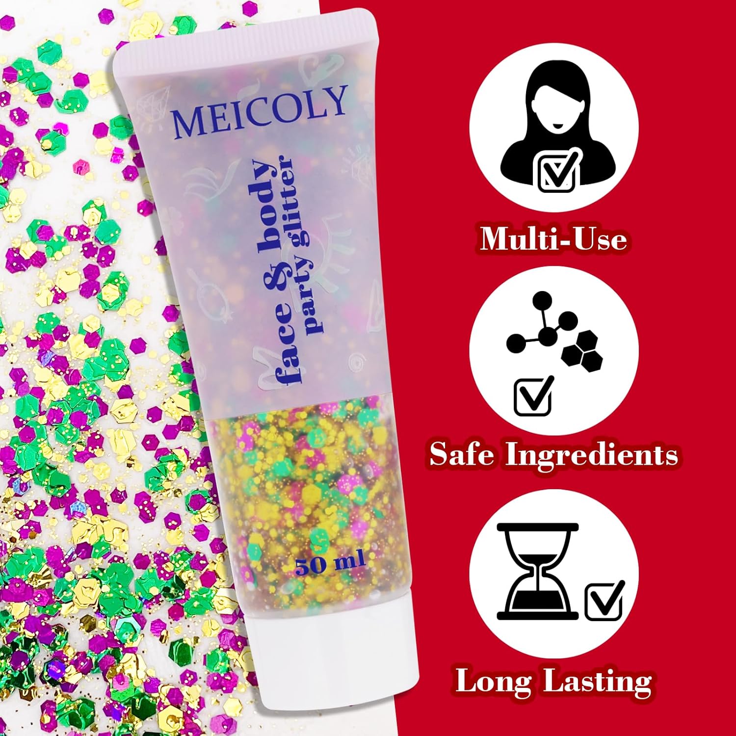 - πππSelf-Adhesive Body Glitter --- MEICOLY mardi gras glitter makeup is a glitter gel that is self-adhesive, so you don't need to use glue when using it,directly apply to anywhere you want with fingertips or brush,save your makeup time.This face body glitter can be used directly in the body or wherever you want to decorate,perfect mardi gras accessories for women