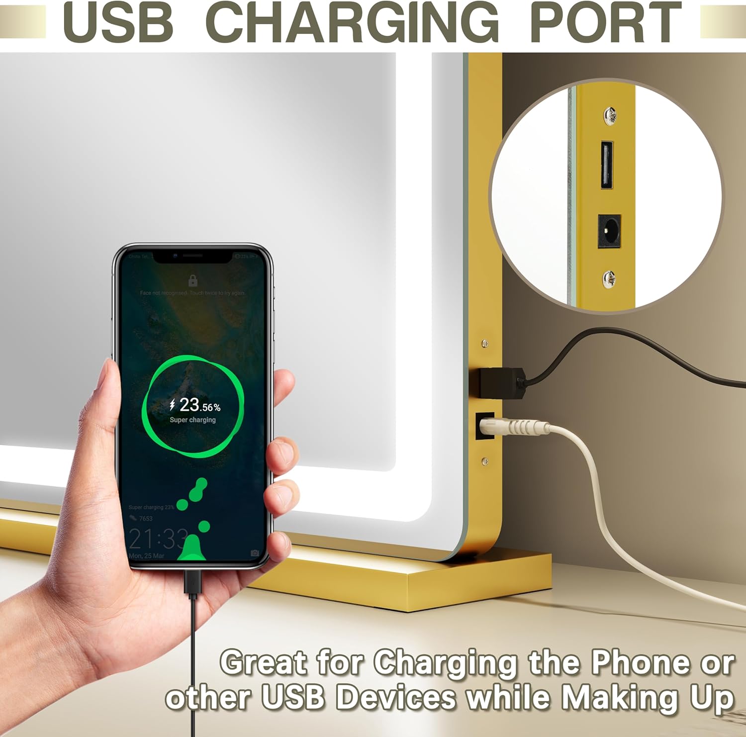 - 【USB CHARGE PORT】 The right side of the vanity mirror is equipped with USB charging ports, which can charge your smartphone, computer or other USB devices, giving you a different and convenient experience.