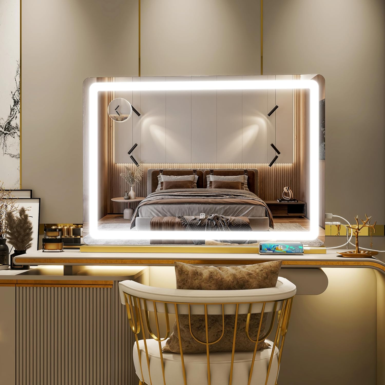 Gold Vanity Mirror with Lights, 32" x 22" Large Lighted Vanity Mirror with Dimmable 3 Modes, LED Makeup Mirror, USB Charging Port, Tabletop or Wall-Mounted