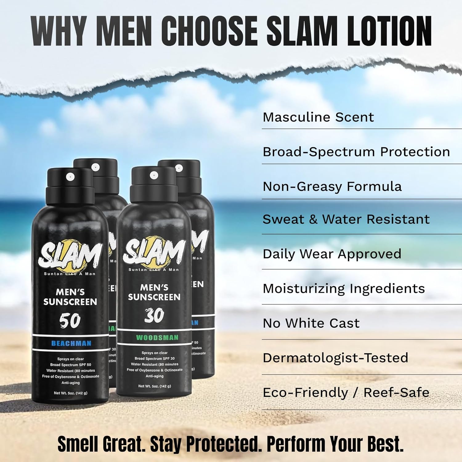 - Manly Teakwood Scented Sunscreen Spray: Embrace the rugged aroma of teakwood with this men’s sunscreen spray. Slam Lotion WoodsMan SPF 50 sun screen spray keeps you protected and smelling great on every outdoor adventure. The perfect size sunscreen spray.