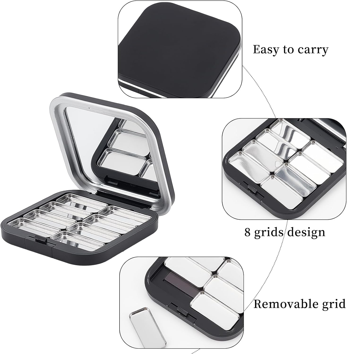 - SIMPLE TO USE: The empty eyeshadow palette is a refillable storage case designed with 8 grids to store different colors. Simple yet delicate, it is perfectly sealed to prevent unnecessary leakage.