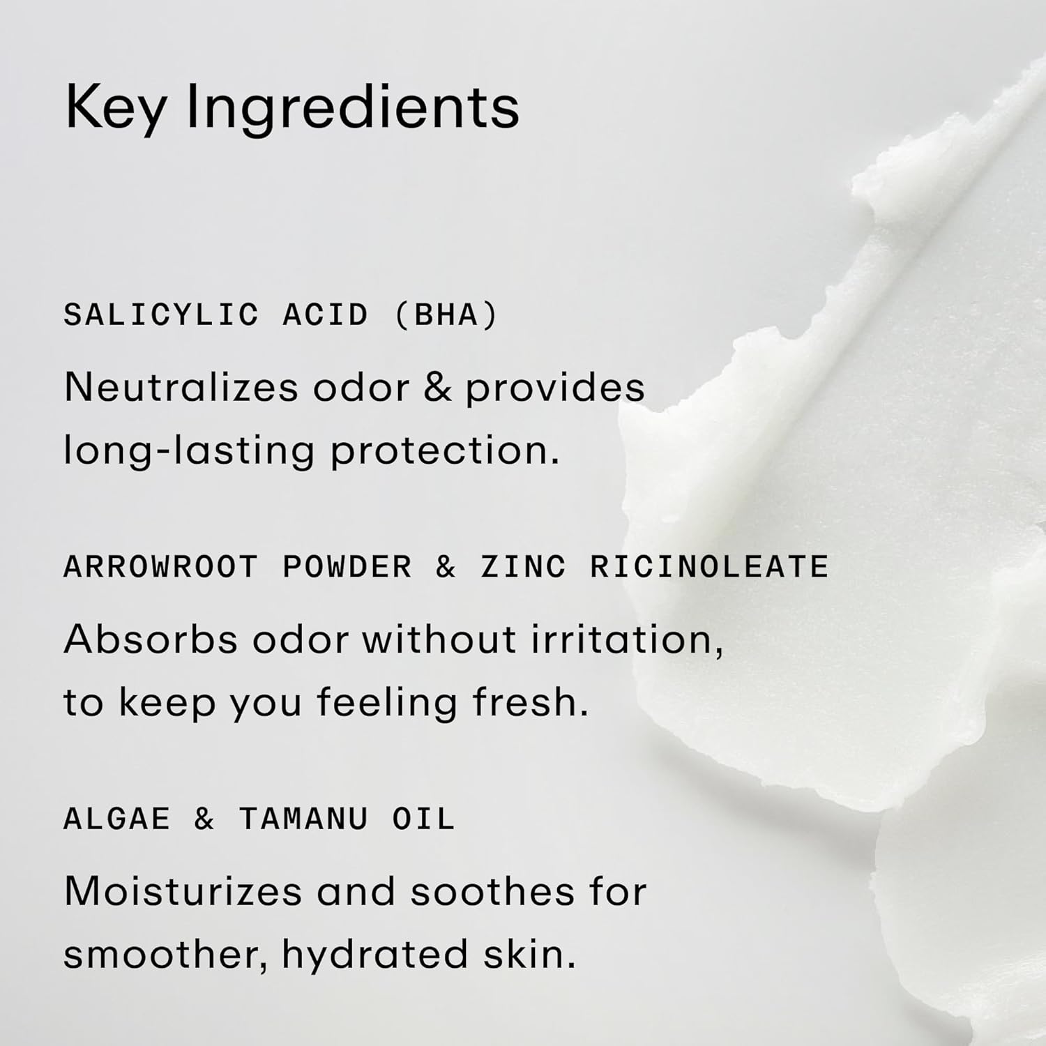 - ARROWROOT POWDER & ZINC RICINOLEATE: Absorbs odor without the irritation, to keep you feeling fresh.