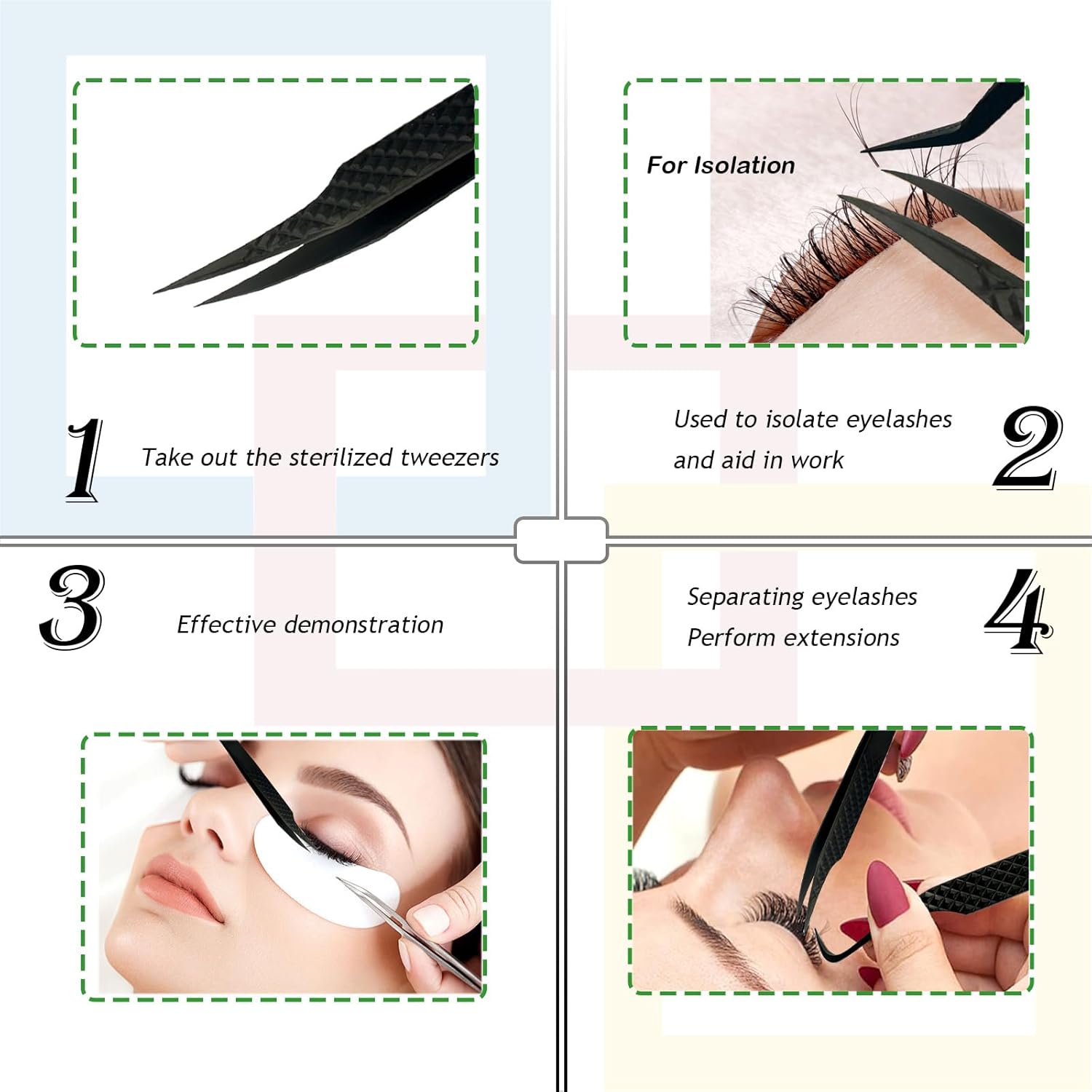 - SUITABLE FOR ALL:Whether you are a beginner or a professional eyelash artist, you will find that these eyelash tweezers have a great isolation effect and are great aids to maximize the efficiency and quality of your work, and the tweezers have been sterilized so you don't have to worry about them at all.