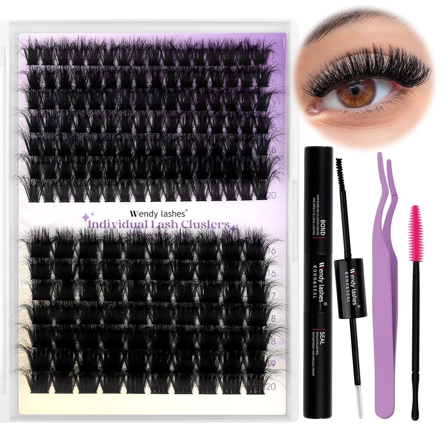 - Lash Clusters Kit: Including lash clusters, lash bond and seal, tweezers for cluster lashes, and eyelash clusters brush, provide all the tools you need to make your eyelash extension in just ten minutes.