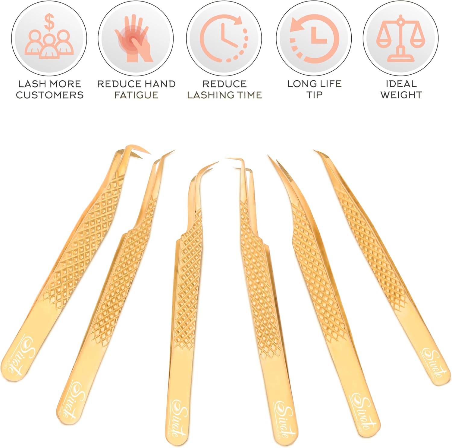 SIVOTE Eyelash Extension Tweezers Fiber Tips Japanese Steel, Set of 6, Curved, Dolphin, 90 Degree 45 Degree, Volume Boot & Slight Curved Tweezer, Gold