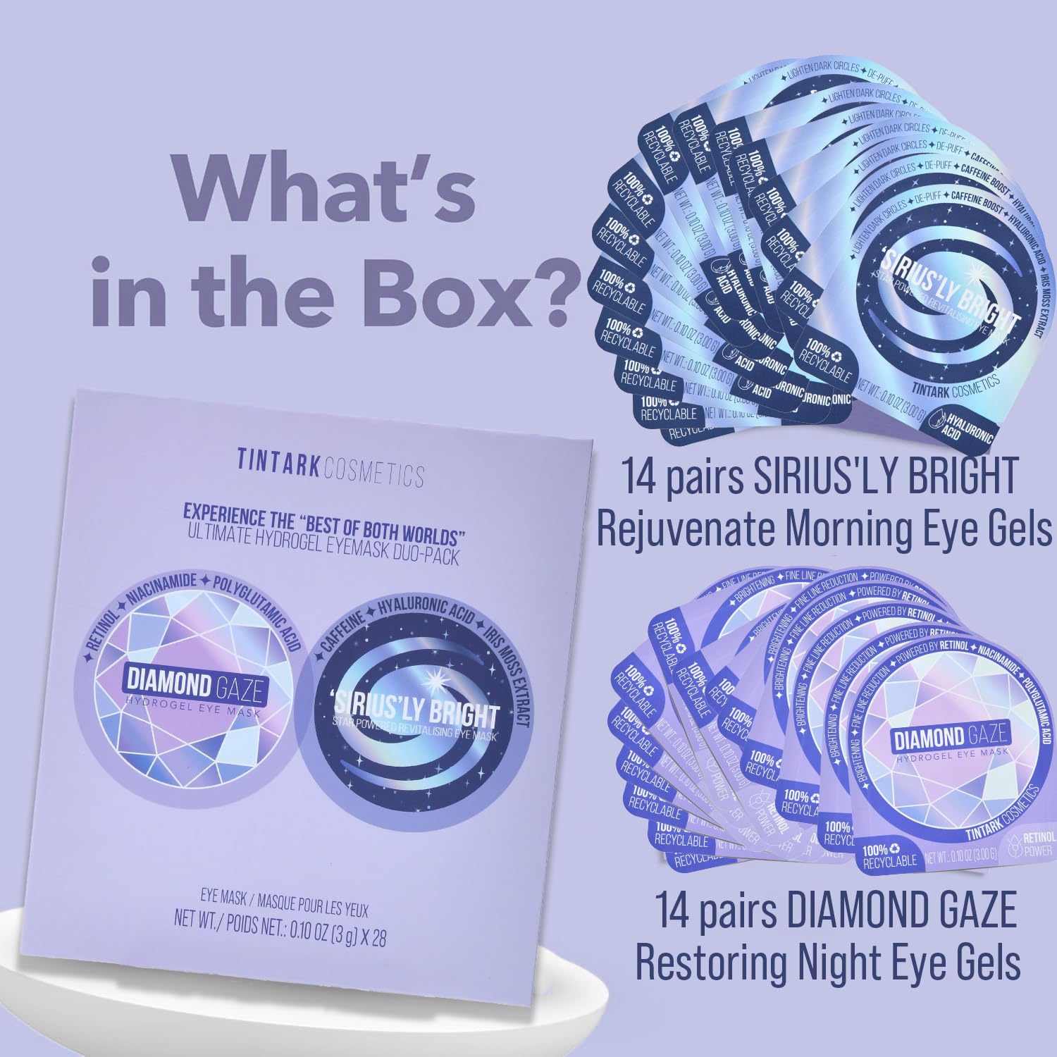 - ULTIMATE HYDROGEL EYEMASK DUO-PACK: Contains 14 pairs of SIRIUS'LY BRIGHT eye masks & 14 pairs of DIAMOND GAZE eye masks. Each pair of eye masks is independent packaging.