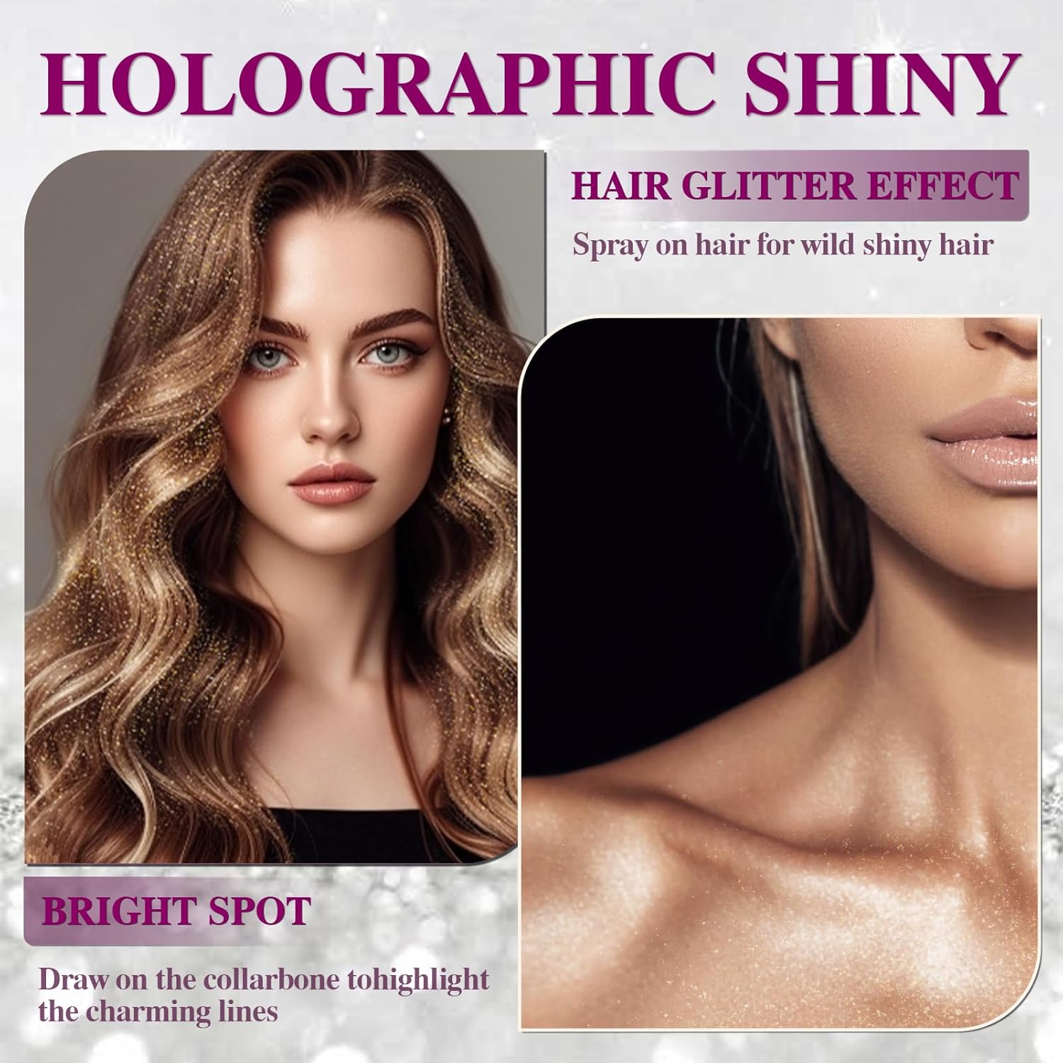 - 【Long-Lasting Hold】Holographic glitter spray is excellent for most skin types with its excellent long-lasting and waterproof quick-drying properties. Simply spray a small amount of glitter on your body, hair or clothing to create a sparkling effect. With its quick-drying and waterproof properties, making it suitable for any weather or occasion.