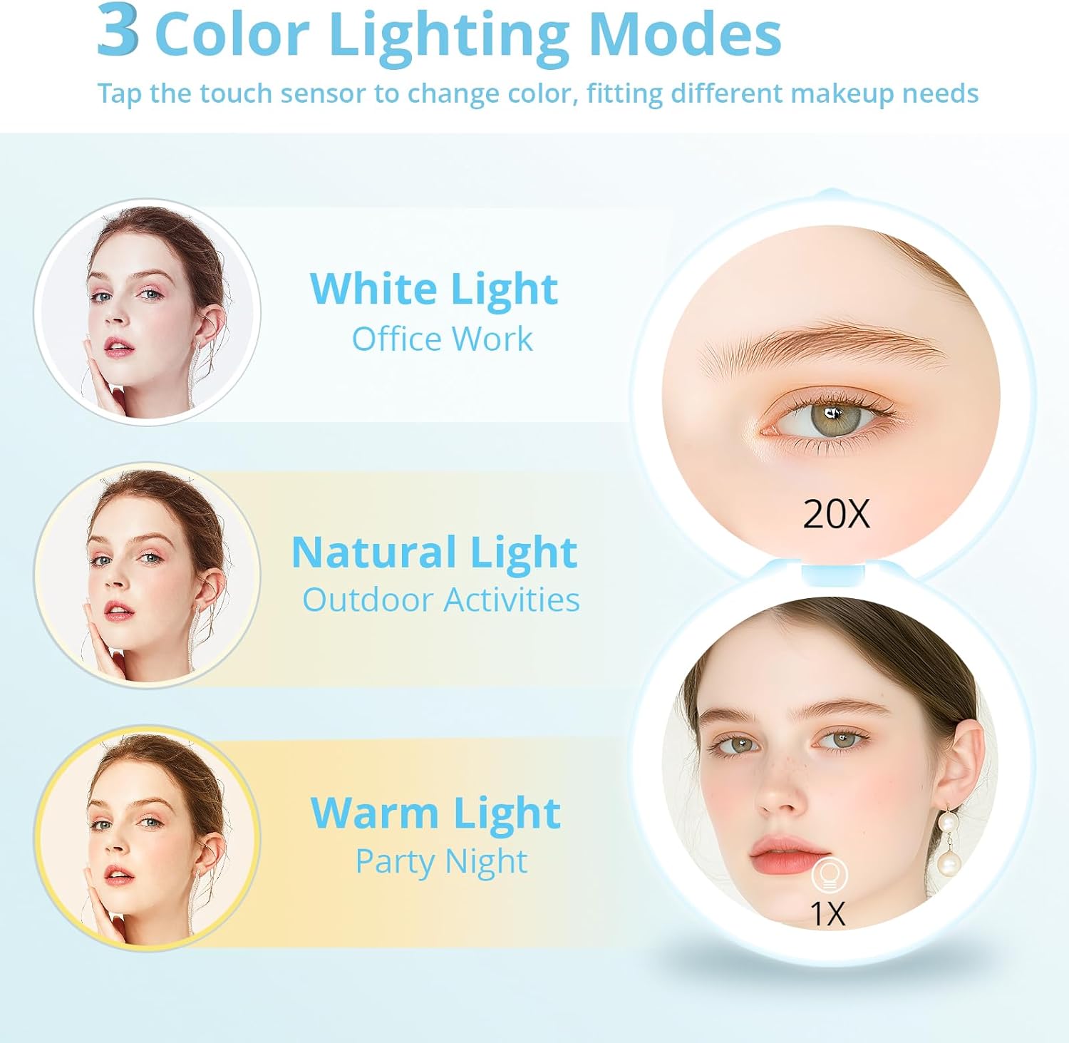 - Double Sided Lighted Mirror with 1x/20x: Upgraded compact mirror provides lighting for both mirror sides. 20x magnified mirror make you more efficient in doing face beauty, checking skin and hair style, and eyelash makeup