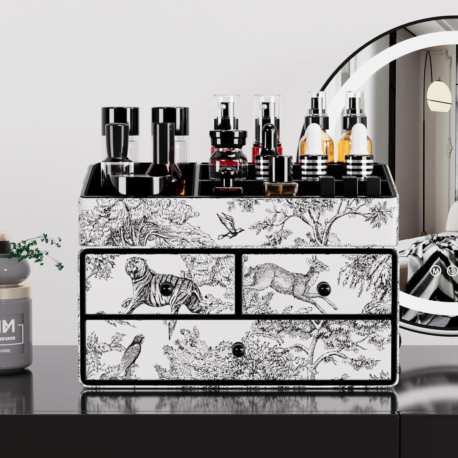 - Unique Gift: The leather makeup organizer for vanity features retro black jungle-themed patterns, with the design distribution unique to each skin care organizer, making every piece one of a kind. It’s a fantastic gift for women on birthdays, Valentine’s Day, Mother's Day, Thanksgiving, Christmas, and other special occasions.