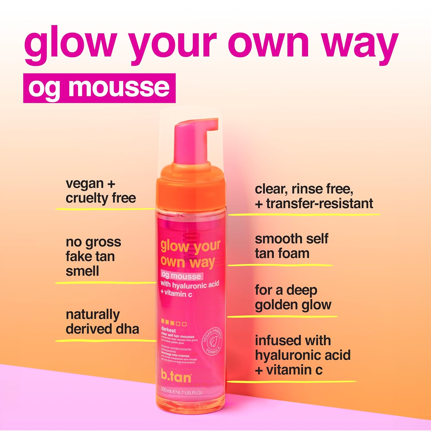 b.tan Clear Self Tanner Foam | Glow Your Own Way - Rinse Free, Best 1 Hour Express Sunless Tanning Water Mousse, Dark, No Transfer, Moisturizing, Face & Body, No Fake Tan Smell, 6.7 Fl oz