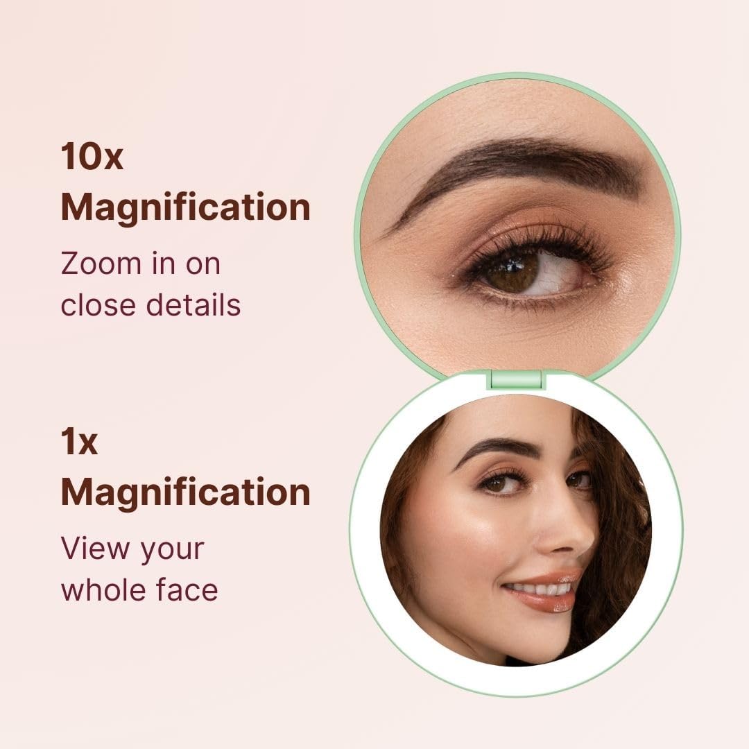 - Double-sided magnification (1x and 10x) so you can apply a full face of makeup, do a quick touch-up on the go, or focus on a detailed task like tweezing or inserting contact lenses