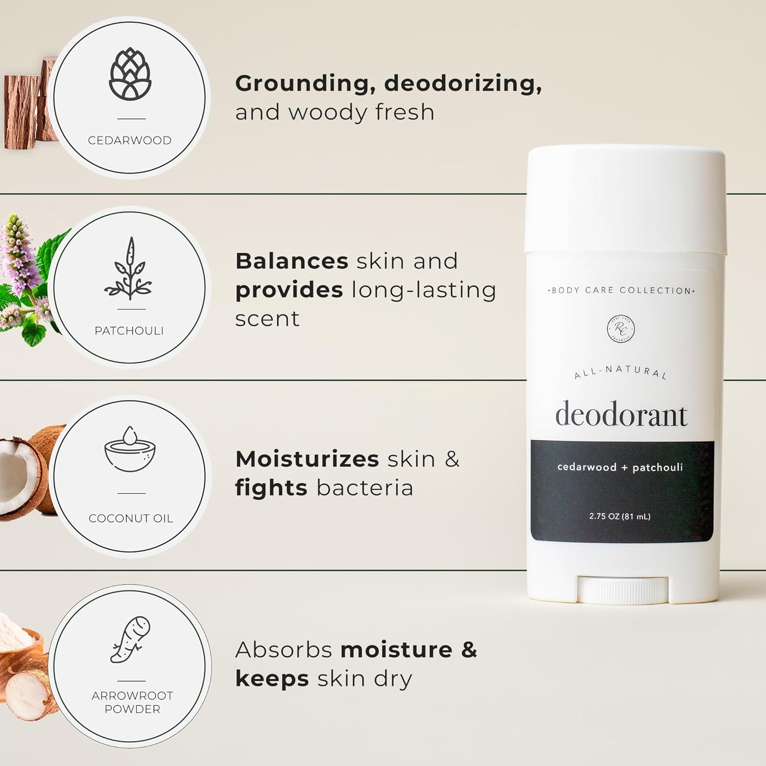 - Infused with Essential Oils: Crafted with cedarwood and patchouli, this men’s natural deodorant has an earthy, woody, slightly sweet scent. Cedarwood promotes calmness, while patchouli’s musky aroma provides warmth and balance for all-day freshness.