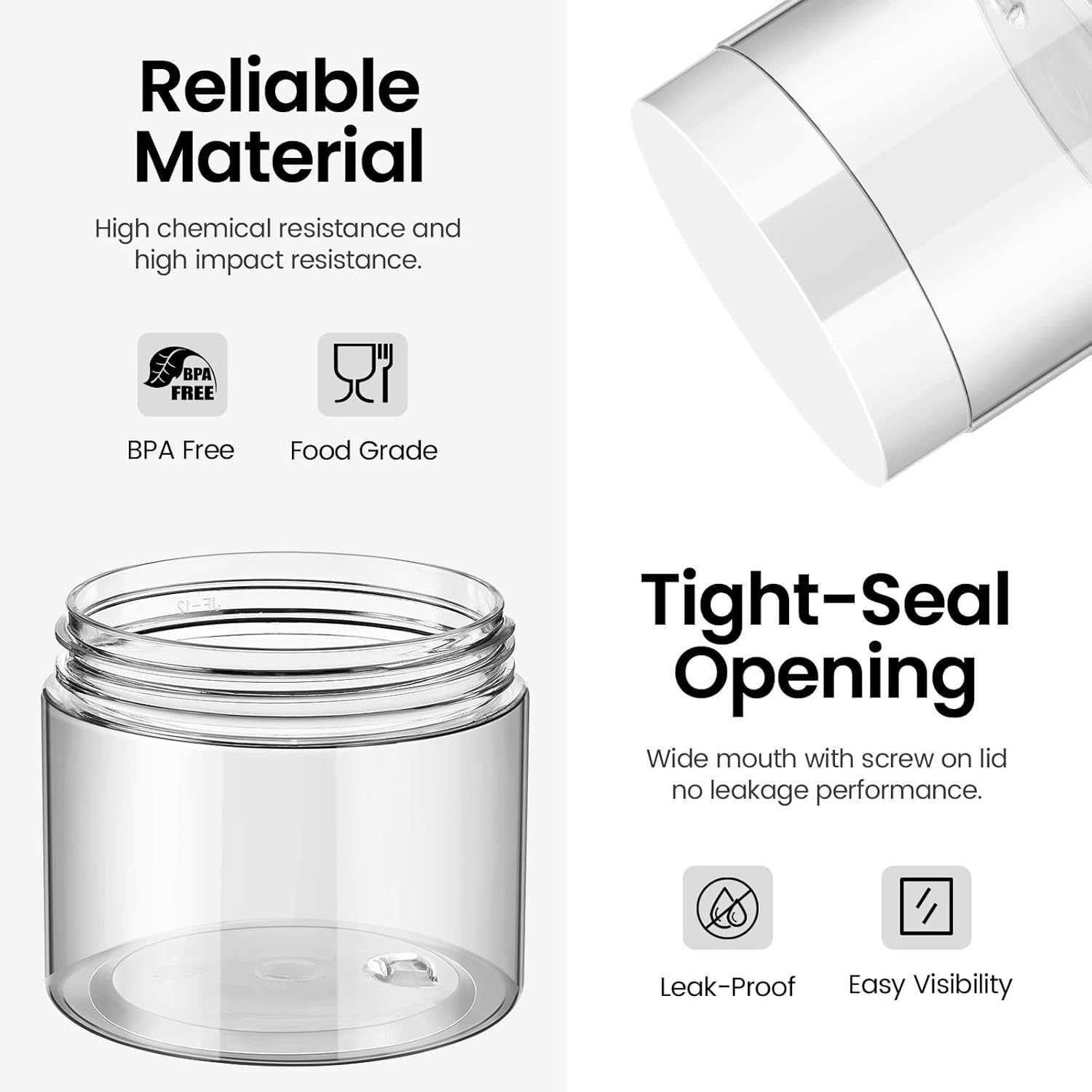 - Premium Quality: Reliable, refillable, clear plastic containers designed with specialized food grade, sturdy, high chemical resistance and high impact resistance PET plastic; holding hot items or cleaning in dishwasher are not recommended.