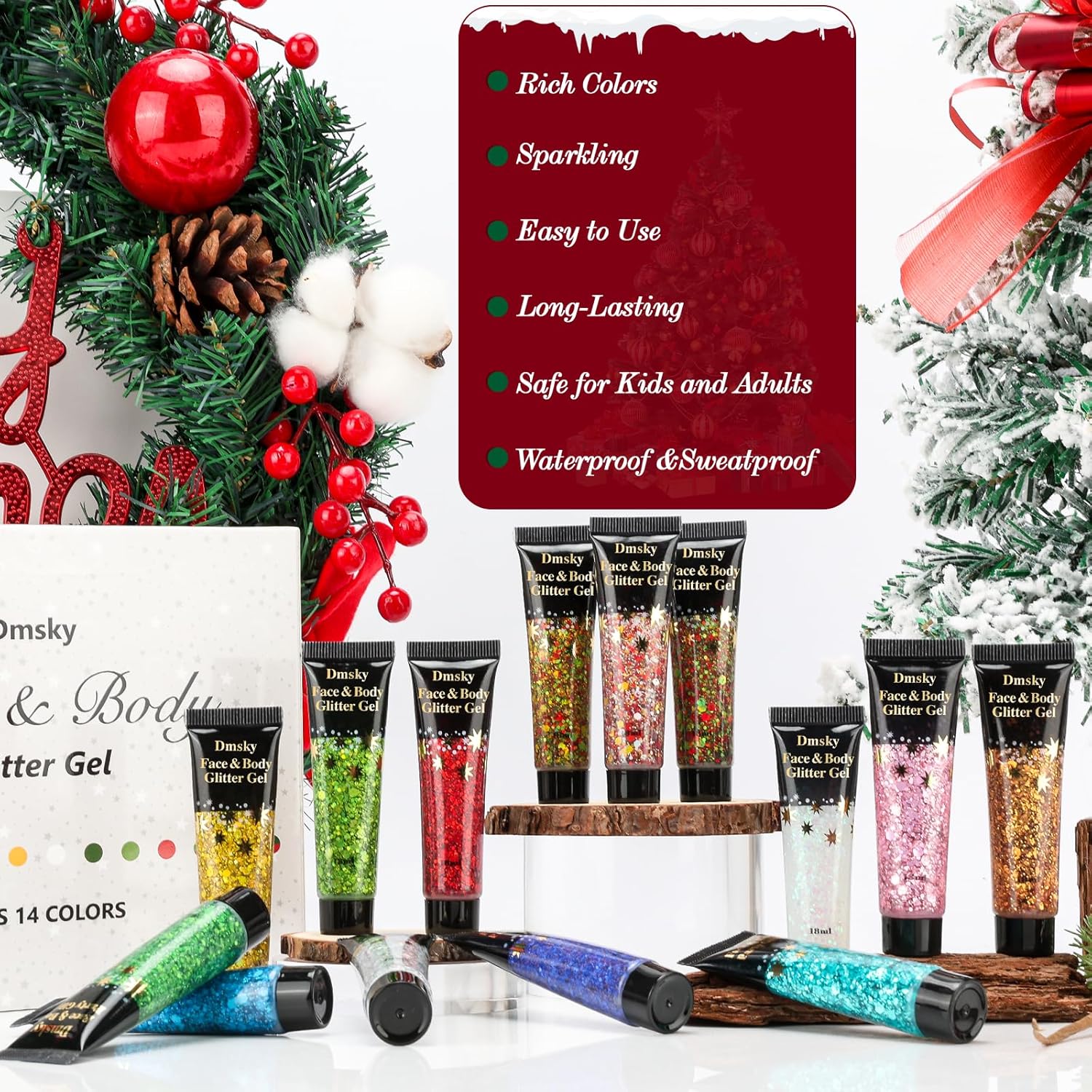 14 Colors Body Glitter,Face Glitter Makeup for Kids Women,Sparkly Chunky Hair Glitter for Eye Lip Nails,Mardi Gras Glitter Makeup Face Paint,Singer Concerts Disco Rave Festival Accessories-Christmas